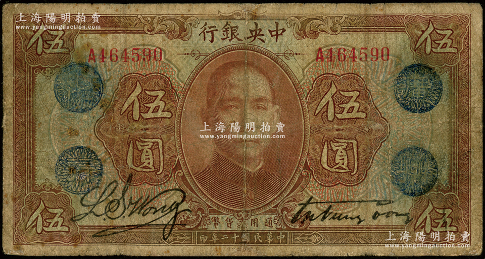 民国十二年(1923年)中央银行棕色伍圆,单字轨,加盖“广州总行”蓝戳,宋子文·黄隆生签名,有修补,近七成新