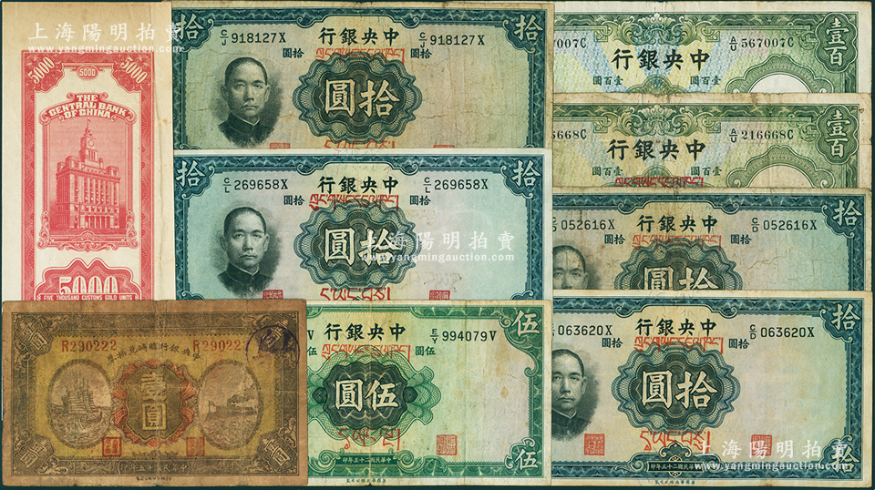 中央银行纸币9枚,详分:1926年临时兑换券壹圆,1936年壹百圆第一版长脚黑签,藏文券伍圆真券、拾圆4枚(含3枚真券、1枚老假票)、壹百圆真券;关金1947年中央厂红色伍仟圆仅背面半成品券;六至八成新,敬请预览