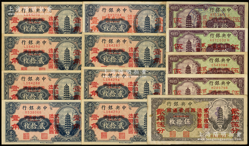 中央银行“四川省通用”辅币券共13枚,详分:拾枚改伍分单字轨2枚、前后字轨2枚(其中1枚上盖纪念戳),贰拾枚改壹角单字轨8枚、伍拾枚改贰角伍分单字轨1枚,七五至九五成新