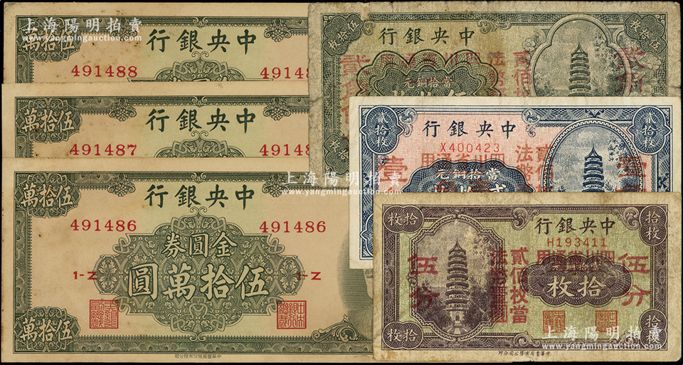 中央银行纸币6枚,详分:四川省通用拾枚改伍分、贰拾枚改壹角、伍拾枚改贰角伍分;金圆券1949年中华版伍拾万圆3枚连号;七至八五成新,敬请预览