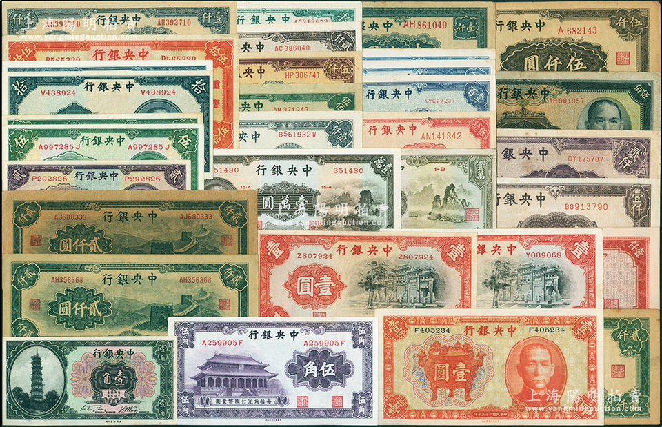 中央银行纸币共32枚,详分:花塔壹角,中华版大成殿伍角,1936年黑牌坊壹圆2枚、宝鼎壹圆,1940年拾圆2种字轨、重庆伍拾圆,1941年贰圆、伍圆2枚,1947年大山水壹万圆、小山水壹万圆;信托版1944年伍佰圆;华南版1945年壹仟圆;大东重庆厂1945年壹仟圆、“长城图”贰仟圆2枚;大业版1945年壹仟圆、贰仟圆、伍仟圆;中央厂1945年伍佰圆、贰仟圆2种;上海厂1945