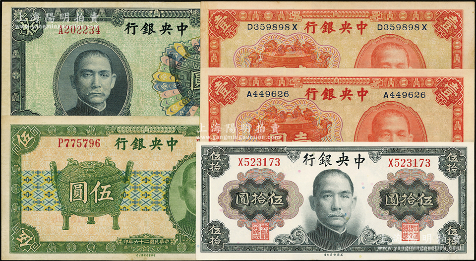 中央银行纸币5种,详分:1936年中华版宝鼎壹圆2种签名、1937年中华版宝鼎伍圆、拾圆,1945年金圆券美钞版孙像伍拾圆,九至九八成新