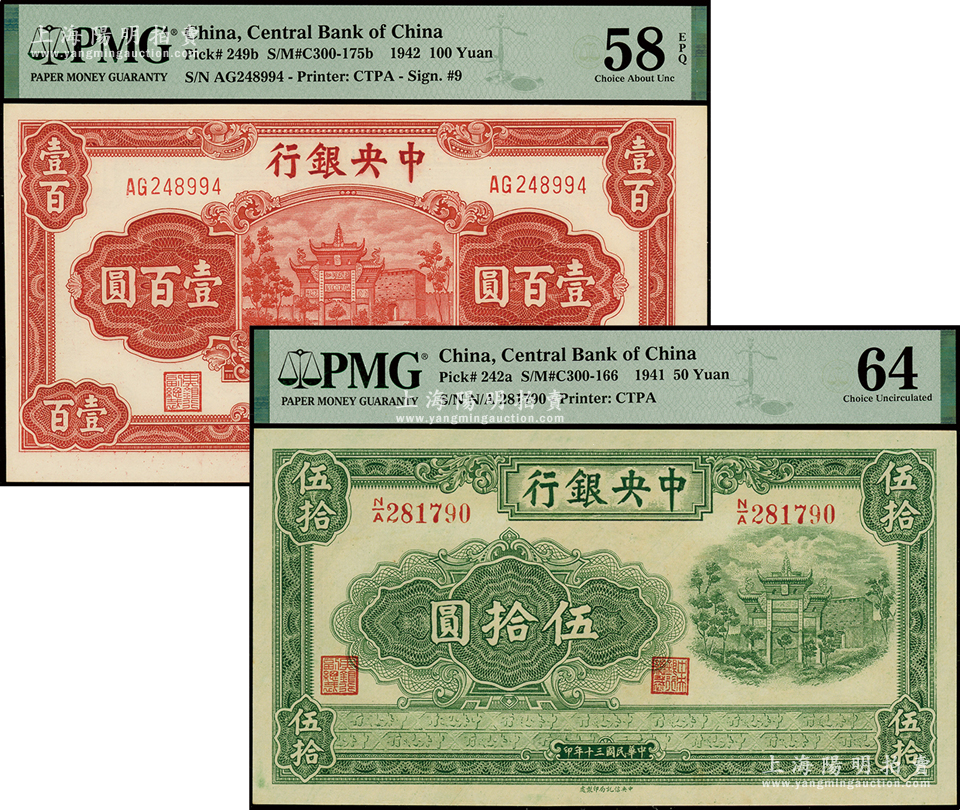 中央银行信托版法币2种,详分:1941年伍拾圆,1942年壹百圆,均为李觉·田亦民签名;海外藏家出品,九五至全新