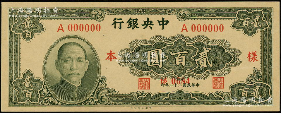 民国三十三年(1944年)中央银行大业版贰百圆仅正面样本券,九八成新