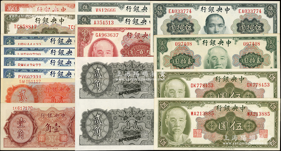 中央银行金圆券共16枚,详分:美钞版1945年壹圆4枚、伍圆2枚、拾圆、贰拾圆无字轨、孙像伍拾圆、蒋像伍拾圆2种签名、壹百圆;德纳罗版1946年壹角、贰角、黑色贰角样本2张联体;中央厂1949年红色伍万圆加印特殊字样者;品相甚佳,八五至全新,敬请预览