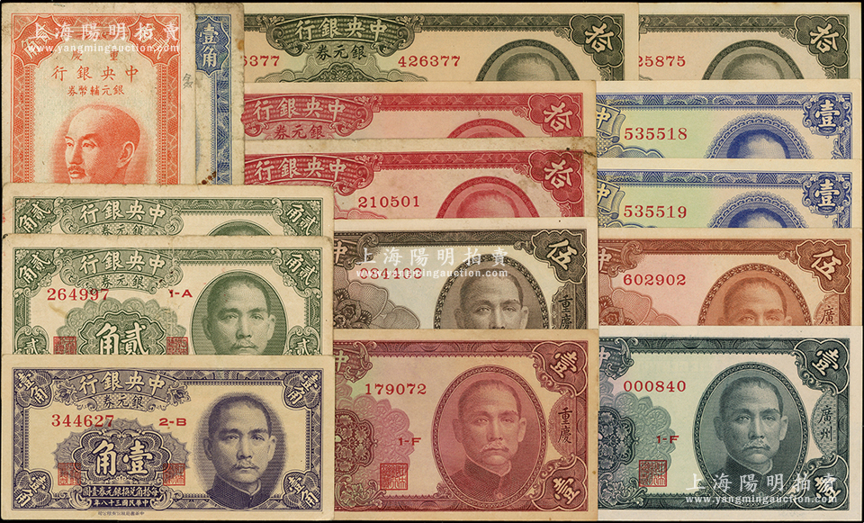 1949年中央银行银元券共15枚,详分:壹角背有签名、贰角背有签名2枚,无地名壹圆2枚连号、拾圆,重庆地名壹角、贰角、壹圆、伍圆、拾圆,广州地名壹圆、伍圆、拾圆2枚,六成至全新