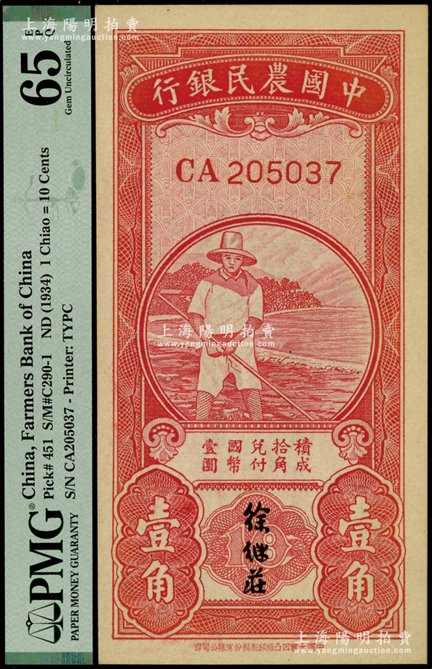 中国农民银行无年份版红色农夫图壹角,双字轨,徐继庄签名;海外藏家出品,PMG UNC 65 EPQ