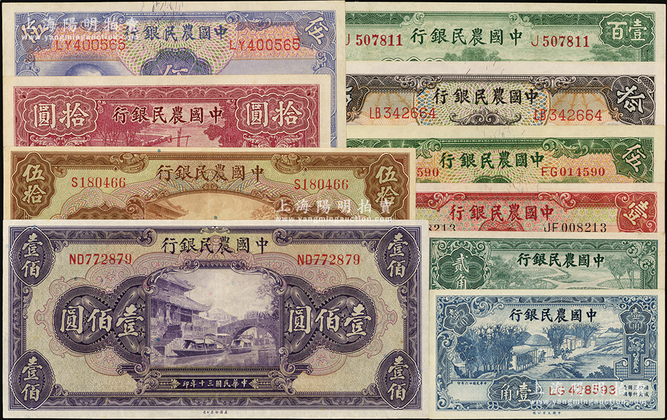 中国农民银行纸币10种,详分:1935年德纳罗版壹圆、伍圆、拾圆,1937年大业版壹角、贰角,1940年大业版拾圆,1941年德纳罗版伍圆、美钞版重庆伍拾圆、壹佰圆,1942年大业版壹百圆,九至九五成新,敬请预览