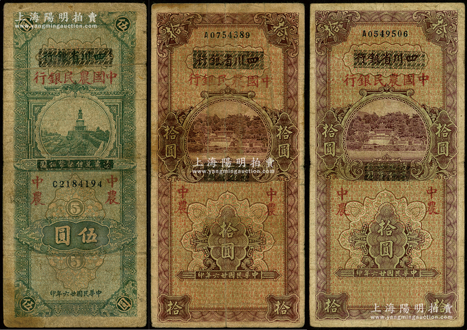民国廿六年(1937年)四川省银行改中国农民银行伍圆1枚、拾圆2枚,合计共有3枚,原票七至七五成新