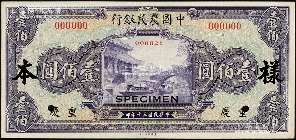 民国三十年(1941年)中国农民银行美钞版壹佰圆样本券,正背共2枚,重庆地名;资深藏家出品,九至九五成新