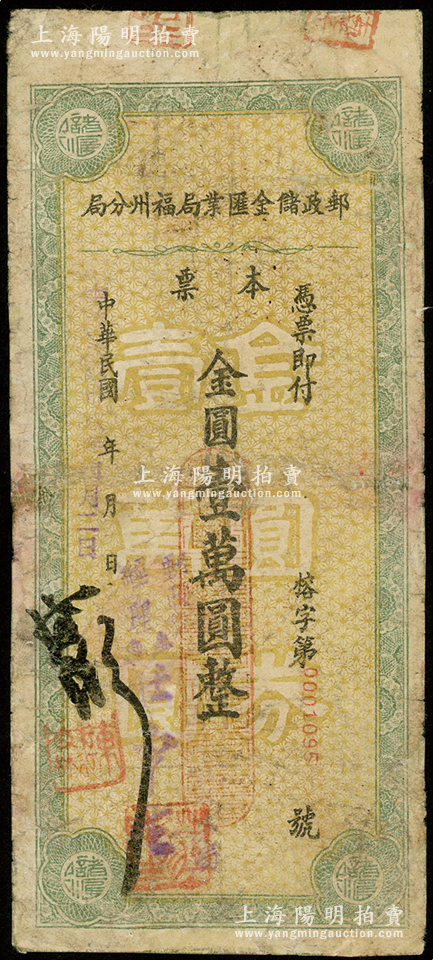 民国卅八年(1949年)邮政储金汇业局福州分局本票金圆壹万圆,该局属国民政府之国家金融机构“四行二局一库”之一;资深藏家出品,罕见且属首度公诸于阳明,有修补,近七成新