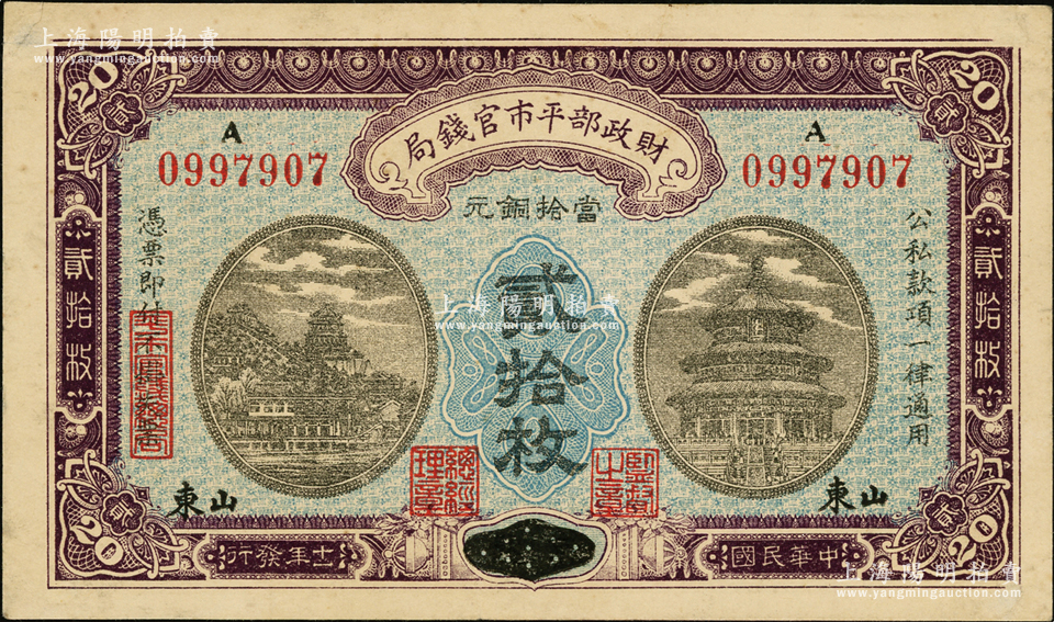 民国十一年(1922年)财政部平市官钱局当拾铜元贰拾枚,京兆改山东地名,A字轨,背面印有英文面额,此品种在Pick目录未见记载,少见,八至八五成新