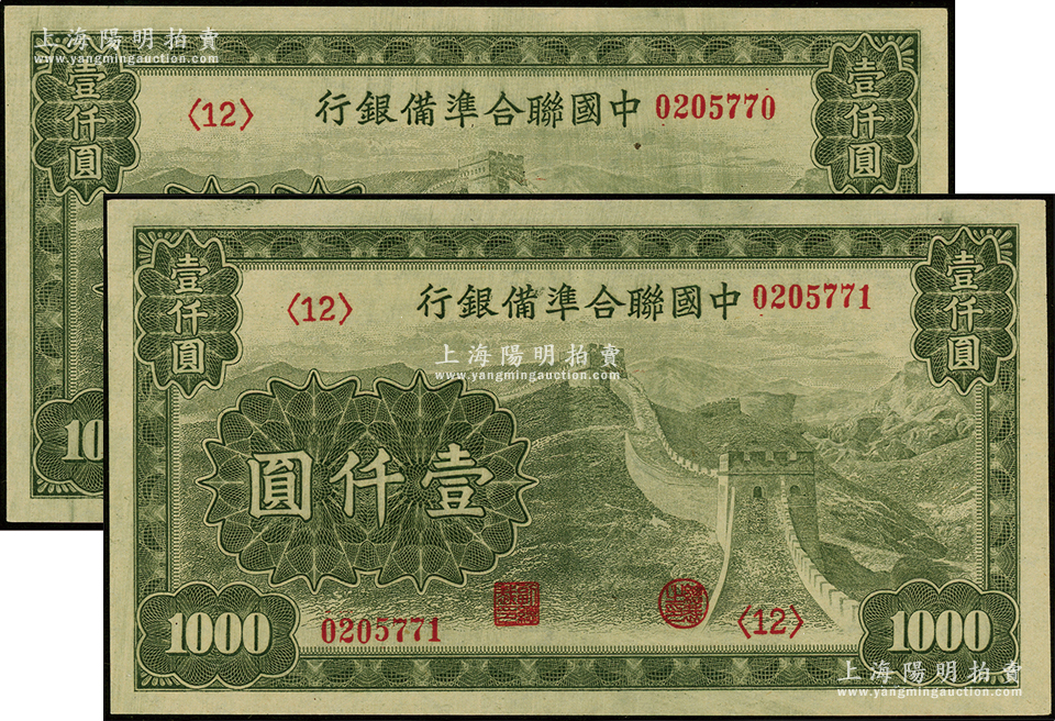 中国联合准备银行长城图壹仟圆共2枚连号,全新