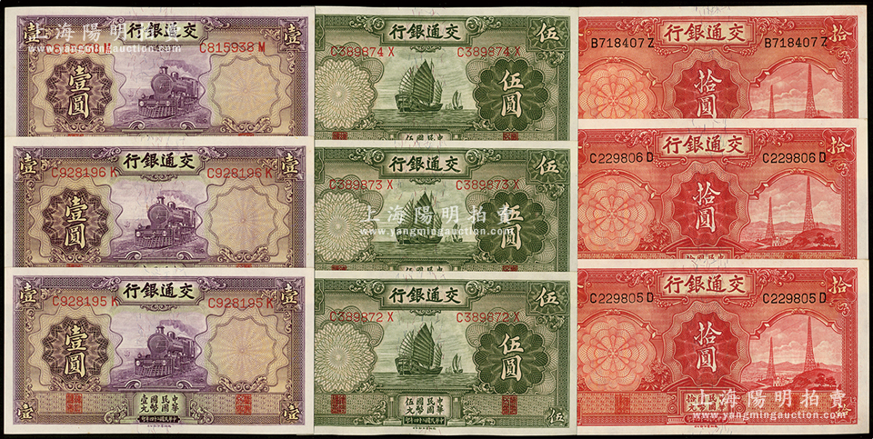民国二十四年(1935年)交通银行德纳罗版壹圆、伍圆、拾圆3套,合计共有9枚,其中壹圆2枚连号,其余各3枚连号;源于前辈名家之遗藏,九八成新