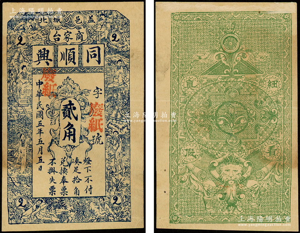 民国五年(1916年)同顺兴贰角样本券,奉天盖平县民间钞票,上印红楼梦仕女图,背印狮头,八五成新
