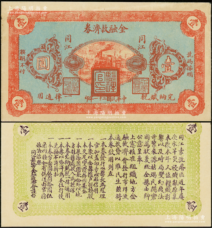 民国二十一年(1932年)同江金融救济券壹圆,上盖“监理官印”,由吉林依兰镇守使、东北军24旅旅长李杜将军所发行,属东北义勇军之抗日军票;少见且品相难得,九成新