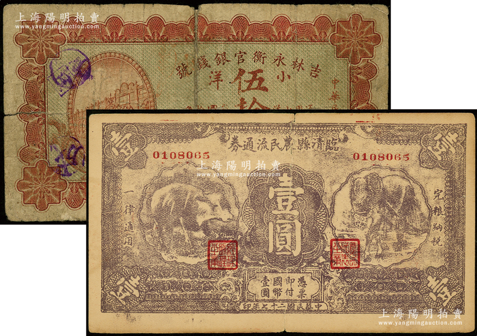 民国纸币2种,详分:吉林永衡官银钱号1918年小洋伍拾圆,临清县农民流通券1938年壹圆,其中1枚背有老式贴纸,六至七成新