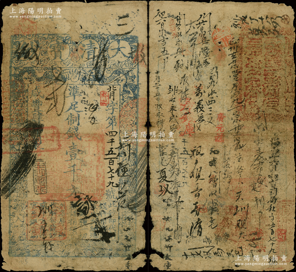 咸丰肆年(1854年)大清宝钞壹千文,背字号,年份下有“臣心如水”之闲章,而面额左下方盖有户部官号“宇恒钱铺”戳记(此官号极为罕见),有背书密密麻麻数十处,曾频繁流通于京师一带;此乃宝钞之最早期版,与后期年份券之图案版式有所不同,其尺寸略小;源于前辈名家之遗藏,近七成新