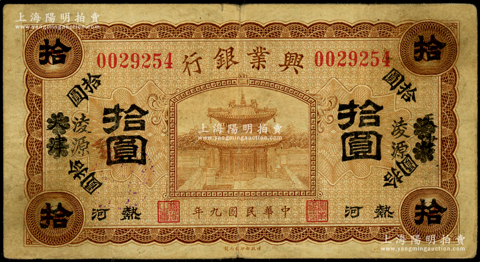 民国九年(1920年)热河兴业银行棕色拾圆,天津改凌源地名;海外藏家出品,七五成新