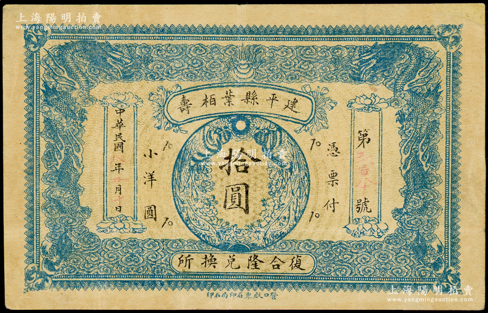 民国八年(1919年)建平县叶栢寿(复合隆兑换所)小洋圆拾圆,属热河省建平县(今属辽宁)钱庄钞票,上印双龙双凤图,少见,右上角有小修,八成新
