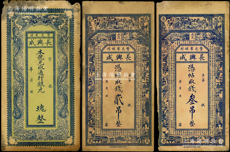 民国初期(赞邑寨裡)长兴成钱票3种,详分:通用银元 块,未填用,上印双龙戏珠,背印喜鹊登枝图;凭帖取钱贰吊、叁吊,上印古人物、博古图及唐代王勃《滕王阁序》古文;直隶赞皇县钱庄钞票,少见,未折七五成新
