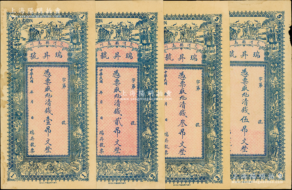 民国年(交河县)瑞昇号·凭票取九六清钱壹吊文、贰吊文、叁吊文、伍吊文共4枚不同,均上印福禄寿三星、八仙及和合二仙图,背印五色旗与轮船,七五至九五成新