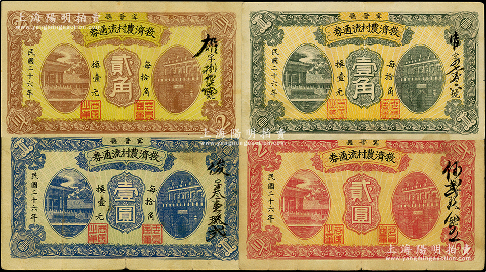 民国二十六年(1937年)宁晋县救济农村流通券壹角、贰角、壹圆、贰圆共4枚全套,均背印商会钤章和告白文字;海外藏家出品,原票七至八成新