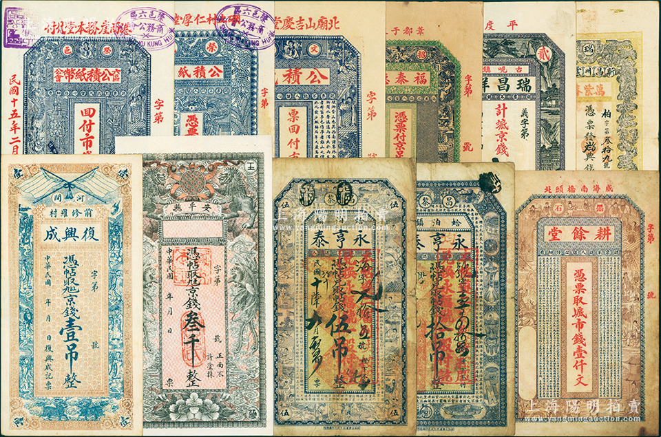 各省民间钞票11种,详分:(河间)复兴成京钱壹吊,(安平县)双狮双凤图京钱叁千,(昌黎)永亨泰1927年伍吊、拾吊;(威海)耕余堂市钱壹仟文,荣邑公积纸币(六区商务公会)1926年市钱壹吊、1927年市钱壹仟文,(文登)公积号市钱壹仟文,(招邑)福泰德京足钱壹吊,(平度)瑞昌祥1926年京钱贰吊;(新昌州)万紫春1912年典钱贰伯文,均形制美观;资深藏家出品,七至九五成新