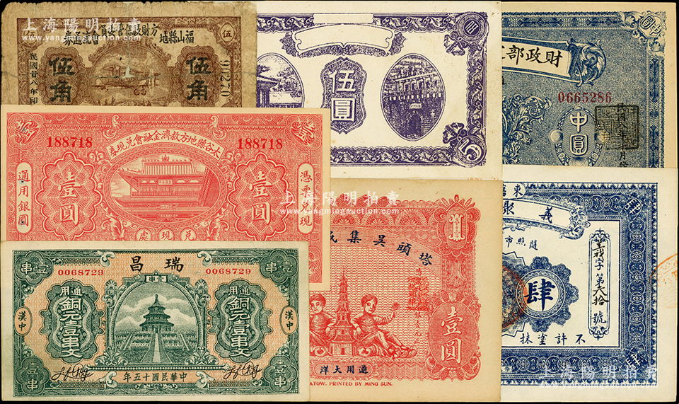 民国钱庄票等共7枚,详分:(束鹿)义聚公会1920年肆百(背印李鸿章像),宁晋县救济农村委员会伍圆半成品;福山县地方财政保管委员会流通券1939年伍角;太谷县地方救济金融会兑现券1932年壹圆;塔头吴集成庄银票1913年壹圆;(汉中)瑞昌1926年铜元壹串文;财政部定期有利国库券1919年中圆;除1枚背有贴补六成新,其余约九至九五成新