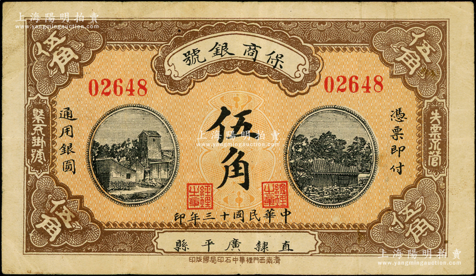 民国十三年(1924年)保商银号伍角,直隶广平县地名,上印二风景图,背印火车图,罕见且属首度公诸于阳明,近八成新