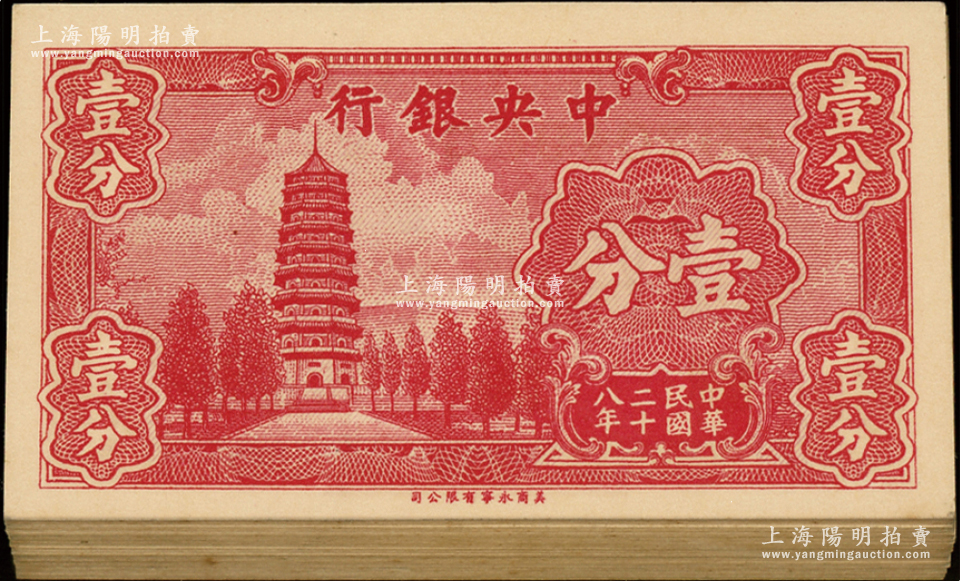 民国二十八年(1939年)中央银行美商永宁版壹分共51枚连号,小厂名版,前后字轨;源于前辈名家之遗藏,全新