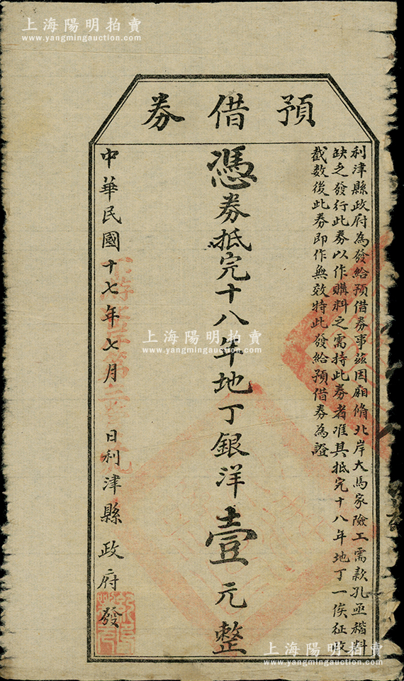 民国十七年(1928年)利津县政府发“预借券”,凭券抵完十八年地丁银洋壹元,此乃地方政府之变相纸币,罕见,七成新