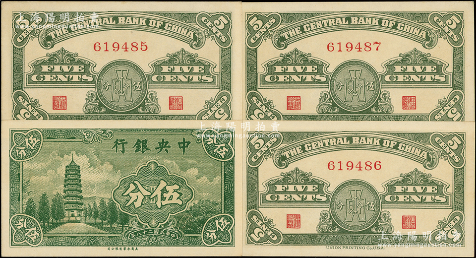 民国二十八年(1939年)中央银行美商永宁版伍分“无字轨”共4枚连号,源于前辈名家之遗藏,少见,全新
