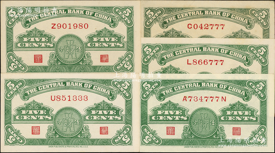 民国二十八年(1939年)中央银行美商永宁版伍分“小趣味号”5枚,详分:单字轨倒置号1枚、豹子号3枚,前后字轨豹子号1枚;源于前辈名家之遗藏,九五至全新
