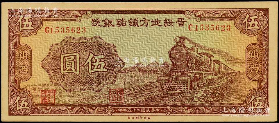 民国二十五年(1936年)晋绥地方铁路银号伍圆,山西地名;海外藏家出品,中未折九五成新