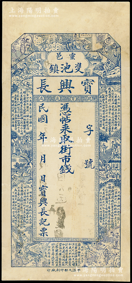 民国年(灵邑)宝兴长未填用,山西灵石县钱庄钞票,上印二十四孝图及唐代司空图《二十四诗品》,形制美观,少见,有修补,七成新