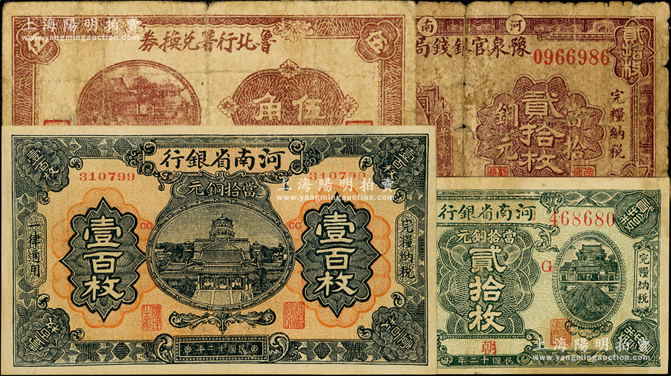 民国纸币4种,详分:河南豫泉官银钱局1918年岳飞像铜元贰拾枚,河南省银行1923年当拾铜元贰拾枚(少见之大号码券)、壹百枚,鲁北行署兑换券1941年伍角,七至八五成新