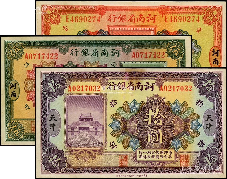 民国十二年(1923年)河南省银行开封龙亭图壹圆、伍圆、拾圆共3枚全套,其中壹圆和伍圆为河南地名、拾圆为天津地名,八至九成新,敬请预览