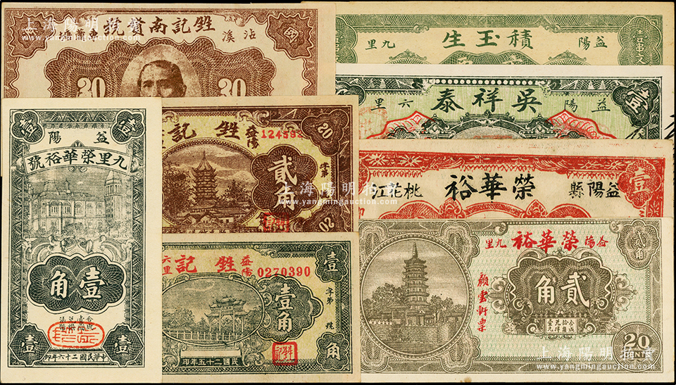 湖南益阳钱票8种,详分:积玉生1918年市票壹串文,吴祥泰壹串,甡记南货号1936年壹角、贰角、孙中山像叁角,荣华裕(号)1936年壹串、无年份贰角、1937年壹角;海外藏家出品,九五至全新