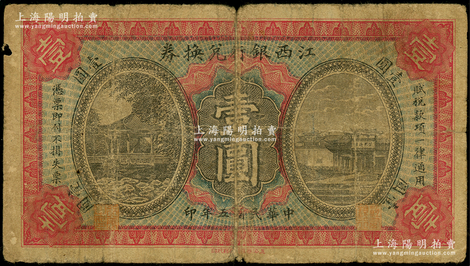 民国五年(1916年)江西银行兑换券壹圆,属第一版“上海商务印书馆代印”,背面号码前冠字为手盖,少见,原票六成新