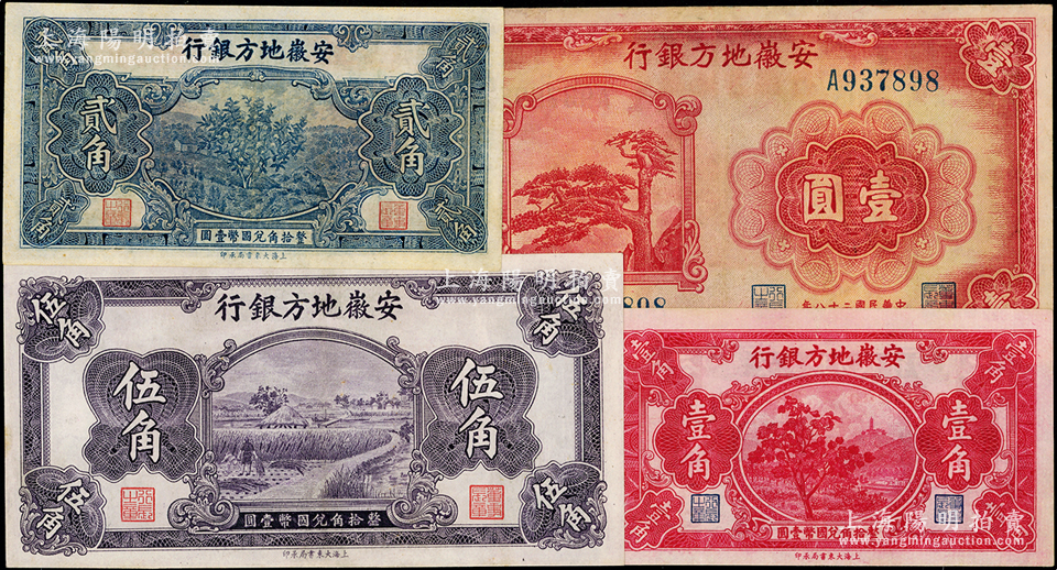 安徽地方银行纸币共4种,详分:果树图壹角、贰角,割稻图伍角,1939年迎客松壹圆,八五至九五成新