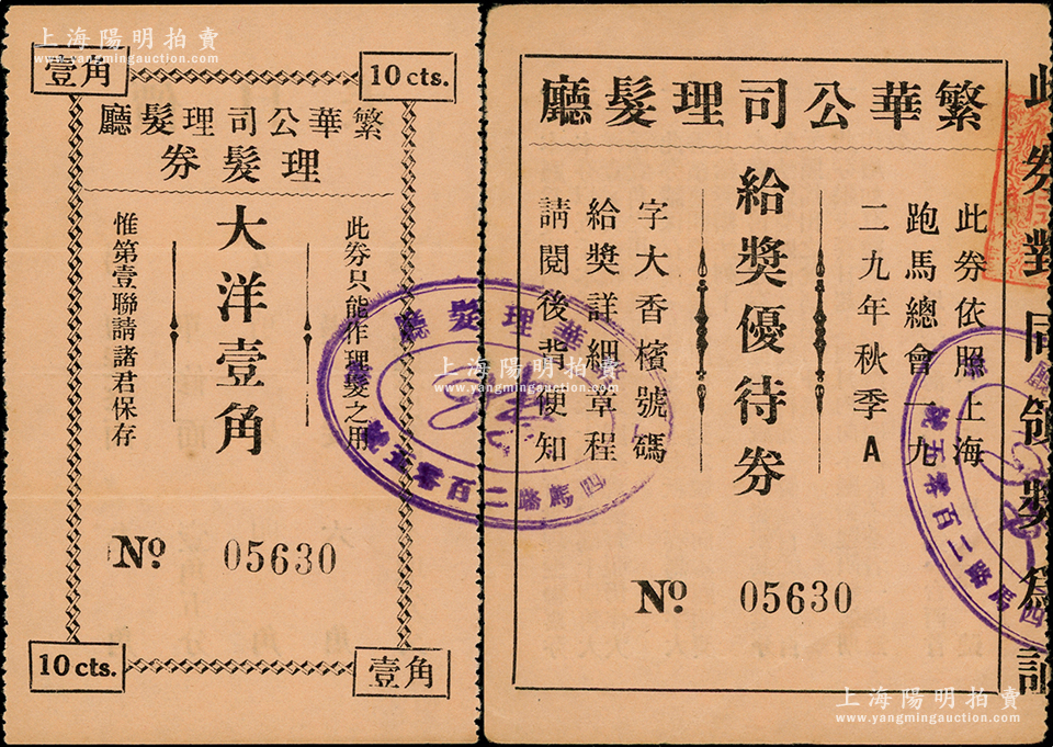 1929年(上海四马路)繁华公司理发厅理发券大洋壹角,附带给奖优待券(依照上海跑马总会1929年秋季A字大香槟号码给奖),背印章程与说明;少见且属首度公诸于阳明,八五成新