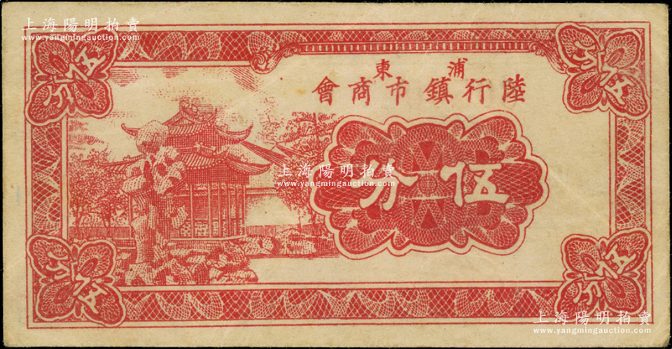 民国二十九年(1940年)浦东陆行镇市商会伍分,上印苏州狮子林风景;陆行,乃属上海浦东市郊;罕见且属首度公诸于阳明,八五成新