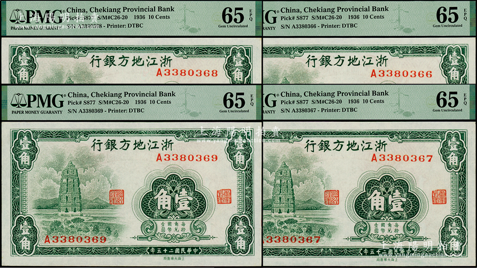 民国二十五年(1936年)浙江地方银行大东版壹角共4枚连号,上印杭州雷峰塔图,全新