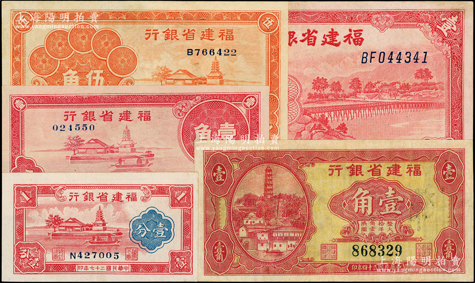 福建省银行纸币5种,详分:1935年第一版大洋辅币券壹角,1936年伍角、1937年壹角无字轨、1938年壹分、1939年壹圆,八至九五成新