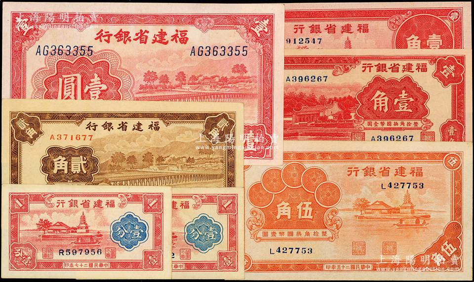 福建省银行纸币7枚,详分:1935年壹角,1936年伍角,1937年壹角,1938年壹分2枚,1939年壹圆,1941年贰角,上佳品相,九五至全新