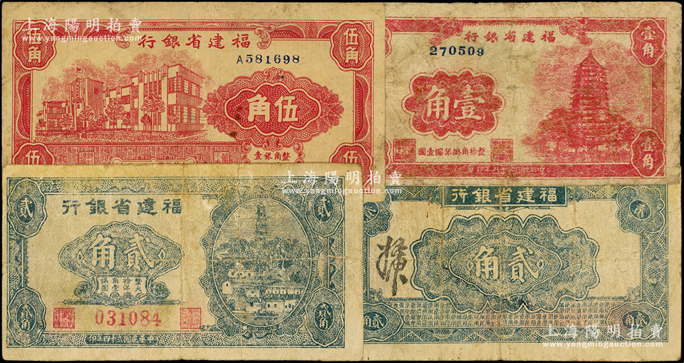 福建省银行纸币3种,详分:1935年大洋贰角,乃属历史同时期之老假票;1949年银元券壹角、伍角;七至七五成新