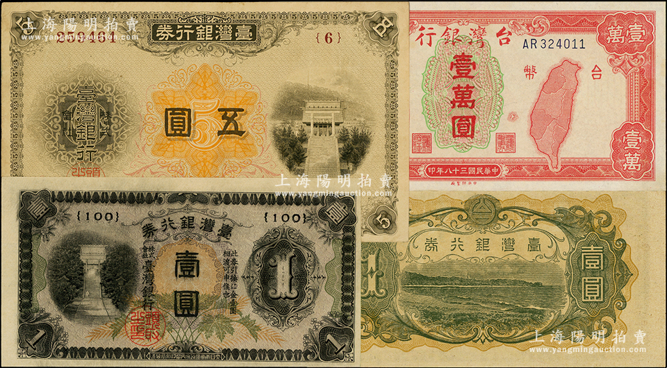 1914至1949年台湾纸币3种,详分:(1914年)五圆、(1942年)乙券短号壹圆、1949年老台币壹万圆,八至九五成新