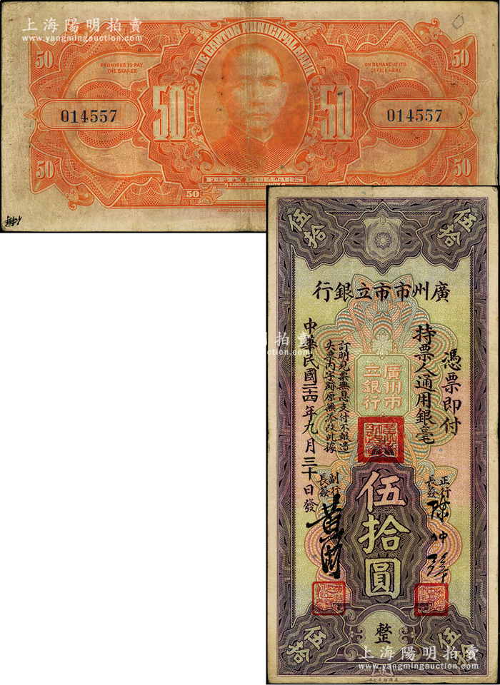 民国二十四年(1935年)广州市市立银行通用银毫伍拾圆,陈仲璧·黄滋签名;岭南藏家出品,罕见,原票八成新,敬请预览