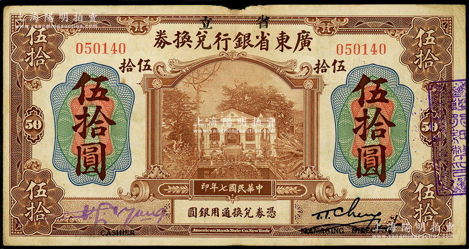 民国七年(1918年)省立广东省银行兑换券伍拾圆,其左边为紫色手签名,且左右签名下均印“Cashier”(出纳)和“Managing Director”(总经理)之英文职务名称,近八成新